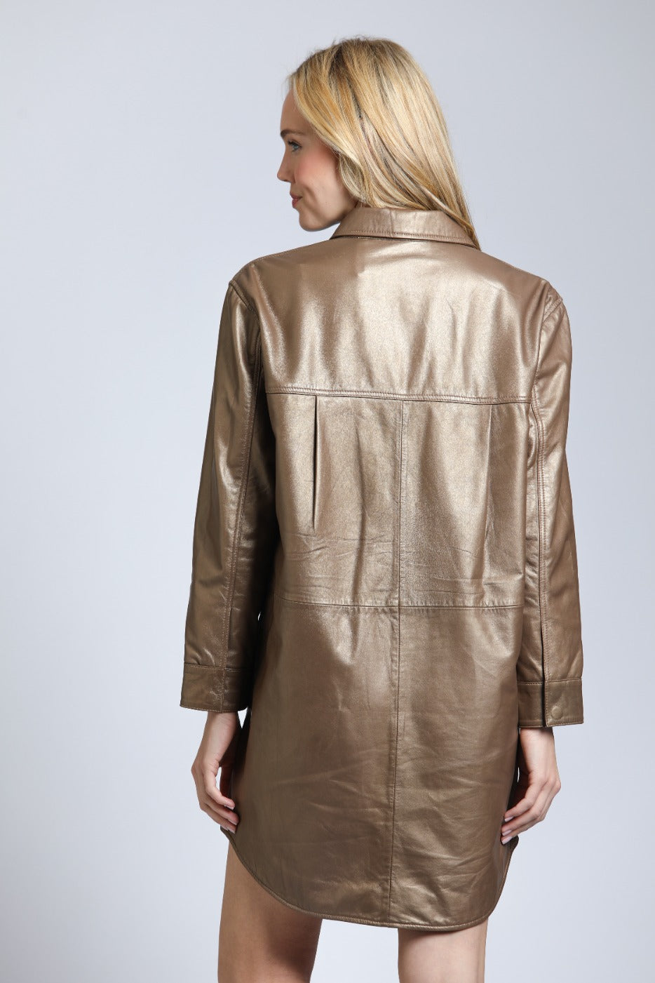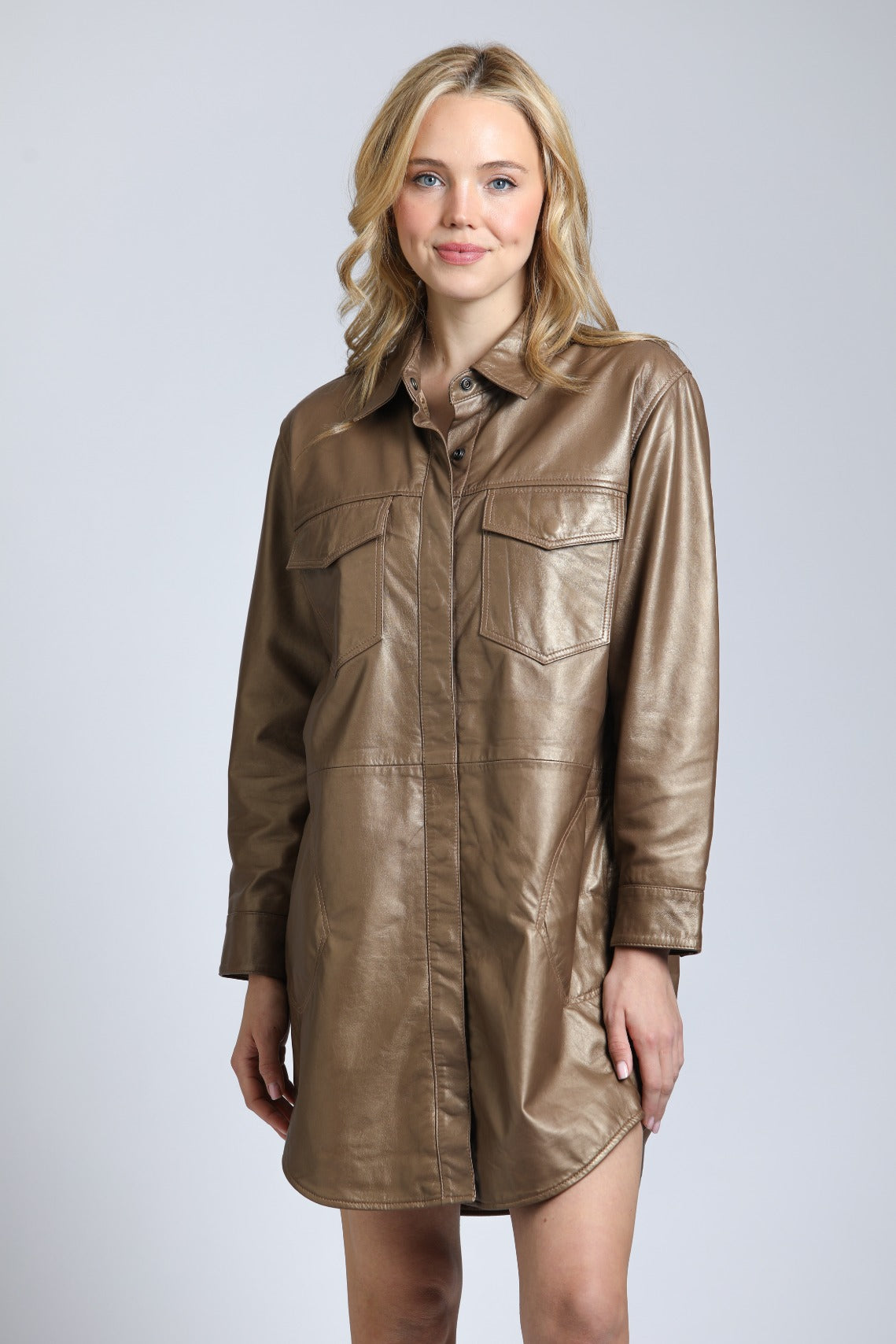 Elevate your wardrobe with the Snap-Up Shirt Dress in Lamb Leather, a perfect blend of sophistication and edge. Crafted from luxuriously soft lamb leather, this dress features a sleek snap-front closure and a structured yet flattering silhouette. Wear it as a standalone statement piece or layer it over a turtleneck and boots for a bold, fashion-forward look.